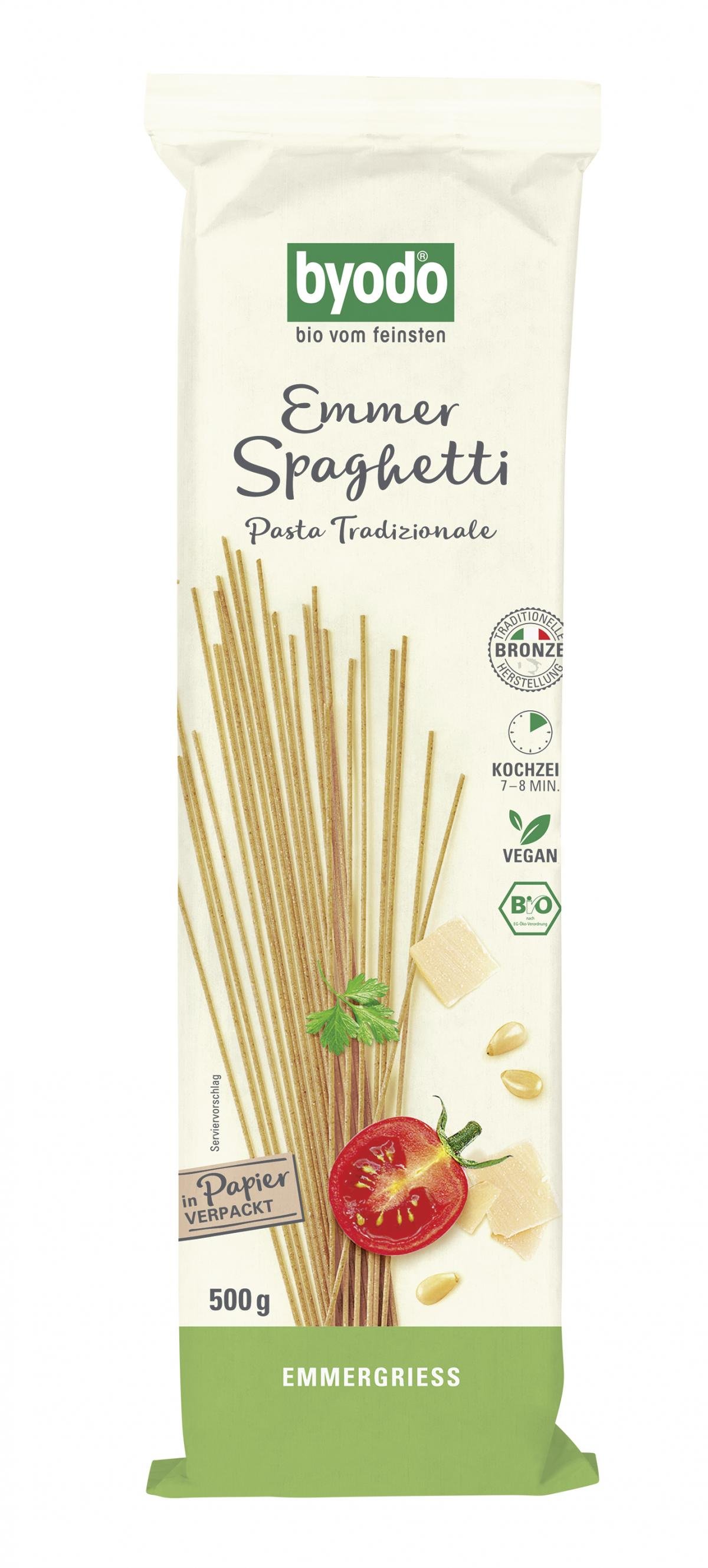 Die Sommerdinkel Spaghetti von Byodo werden aus dem Urgetreide Emmer hergestellt. Die hellen Nudeln haben einen leicht-nussigen Geschmack.